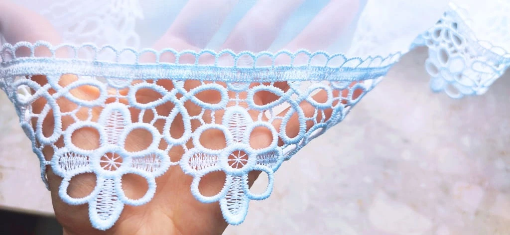Zazdrostka ma obszyte boki, u góry uszyty tunel 2,5cm na patyk. Nad tunelem falbanka 3 cm. Posiada wszytą koronkę gipiurową wzór kwiatów 8 cm.