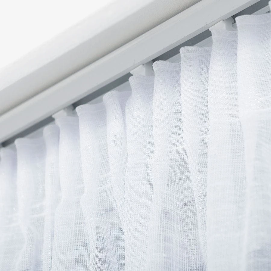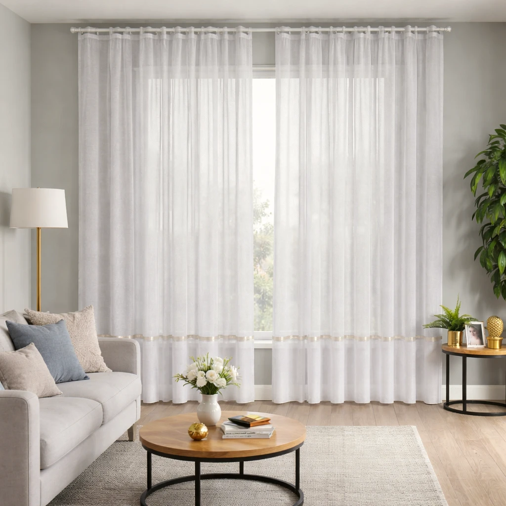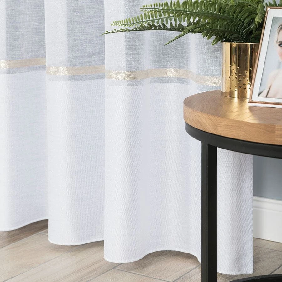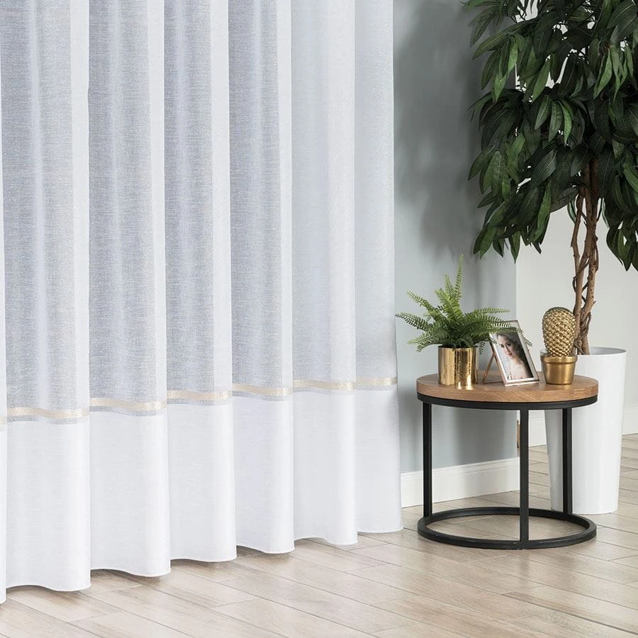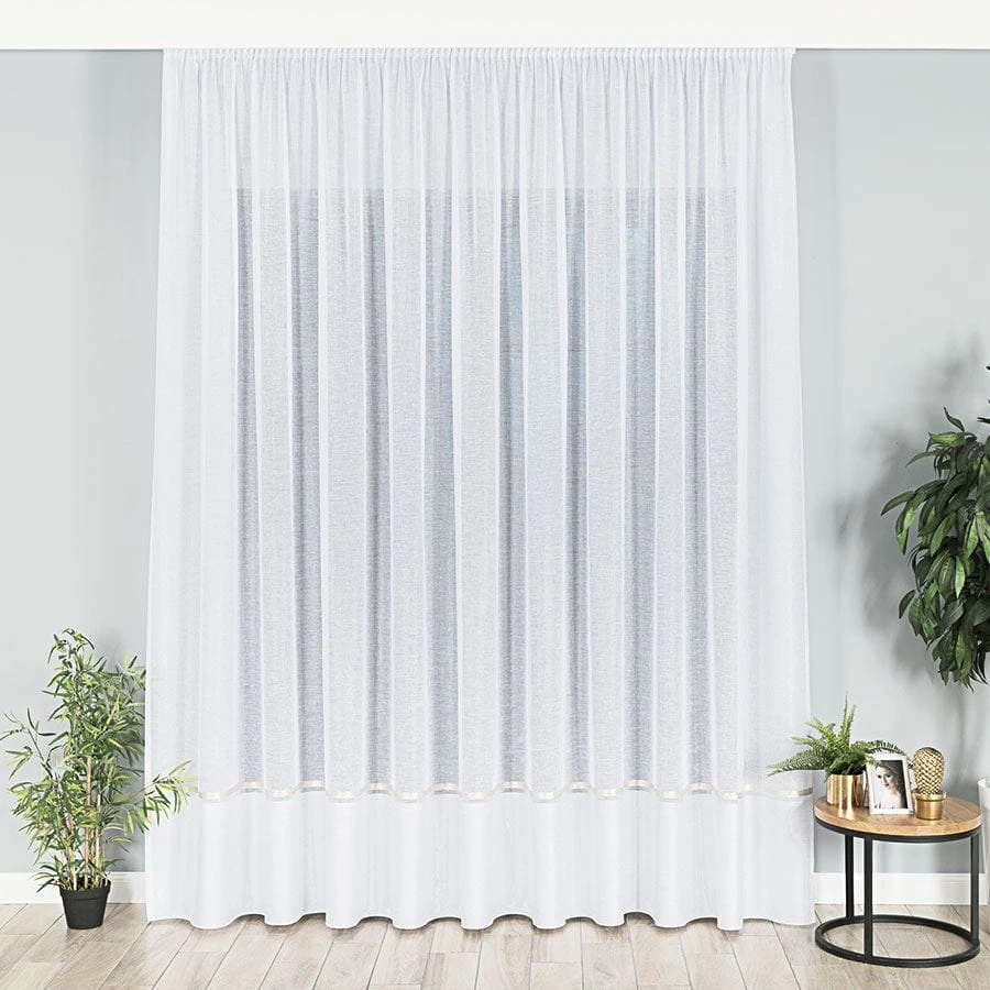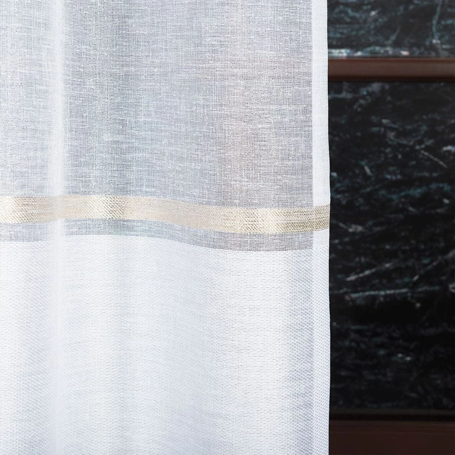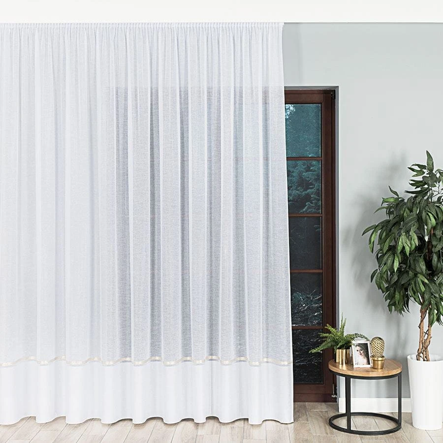 Firanka fantazyjna ze wzorem na samym dole z ołowianką, wysokość 330cm, kolor biały ze złotym pasem