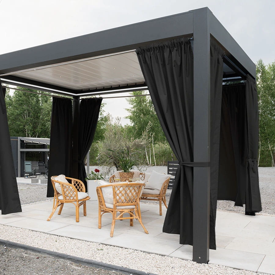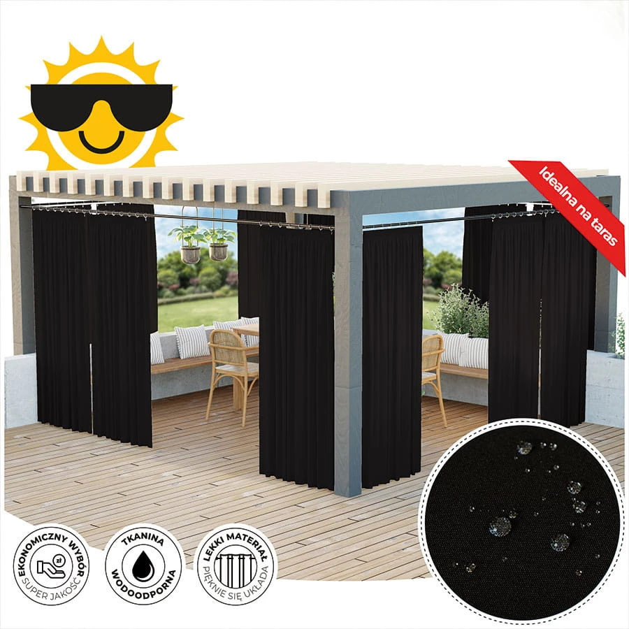 Zasłona ogrodowa Gardenia wodoodporne wykończenie chroni przed deszczem oraz wilgoci, dzięki czemu będzie bardziej odporna na czynniki zewnętrzne. Przeznaczona jest do użytkowania na tarasie, pergoli, balkonie czy altanie. Zasłona wykończona taśmą wielofunkcyjną z możliwością zawieszenia na żabki, agrafki oraz tunel. Kolekcja zasłon Gardenia składa się z siedmiu kolorów dostępnych w różnych rozmiarach.