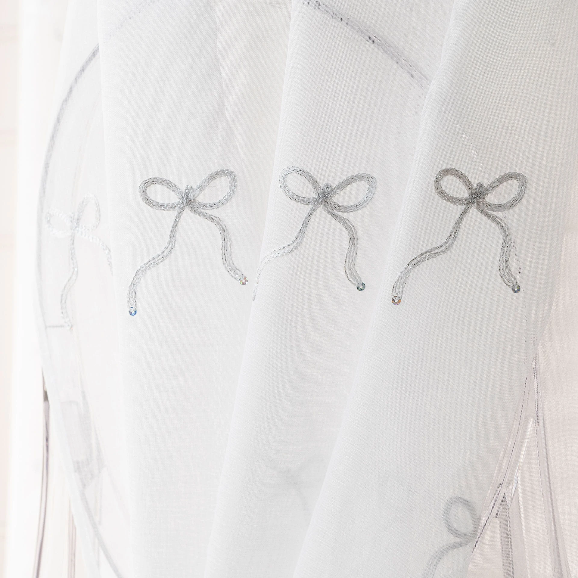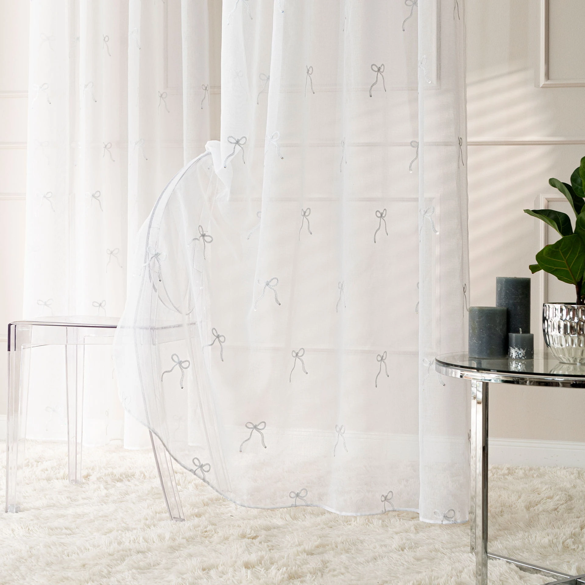 KOKARDKA Firana gotowa na etaminie, haftowana, na taśmie, z ołowianką, szerokość 140 x wysokość 250cm, kolor biały ze srebrnym