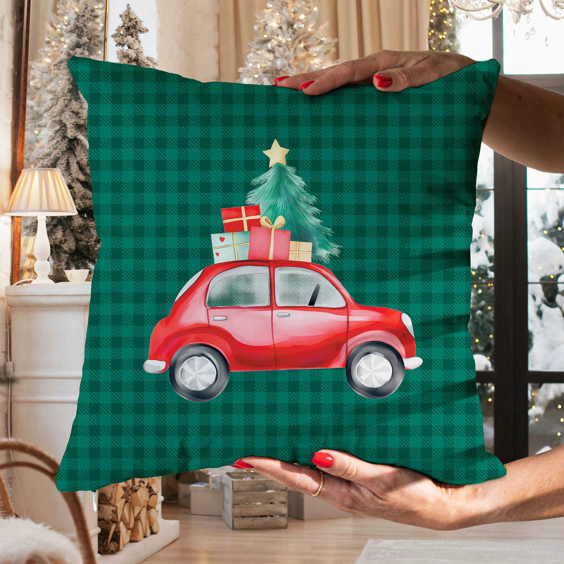 KRATA Z SAMOCHODEM, BAJKOWE ŚWIĘTA Poszewka dekoracyjna VELVET, 40x40cm, kolor zielony