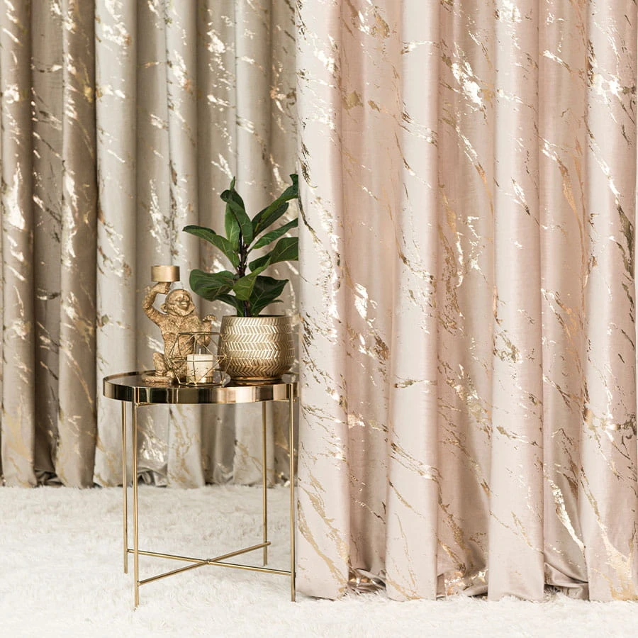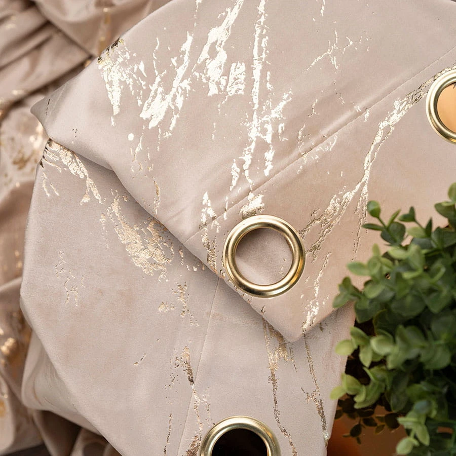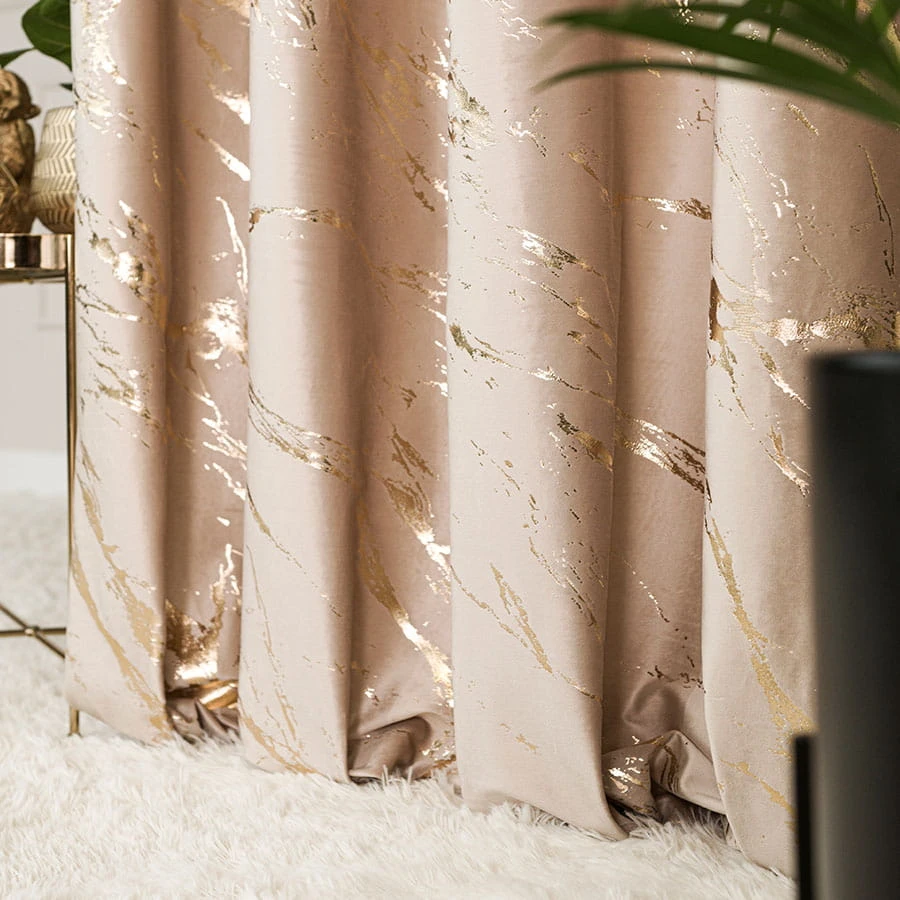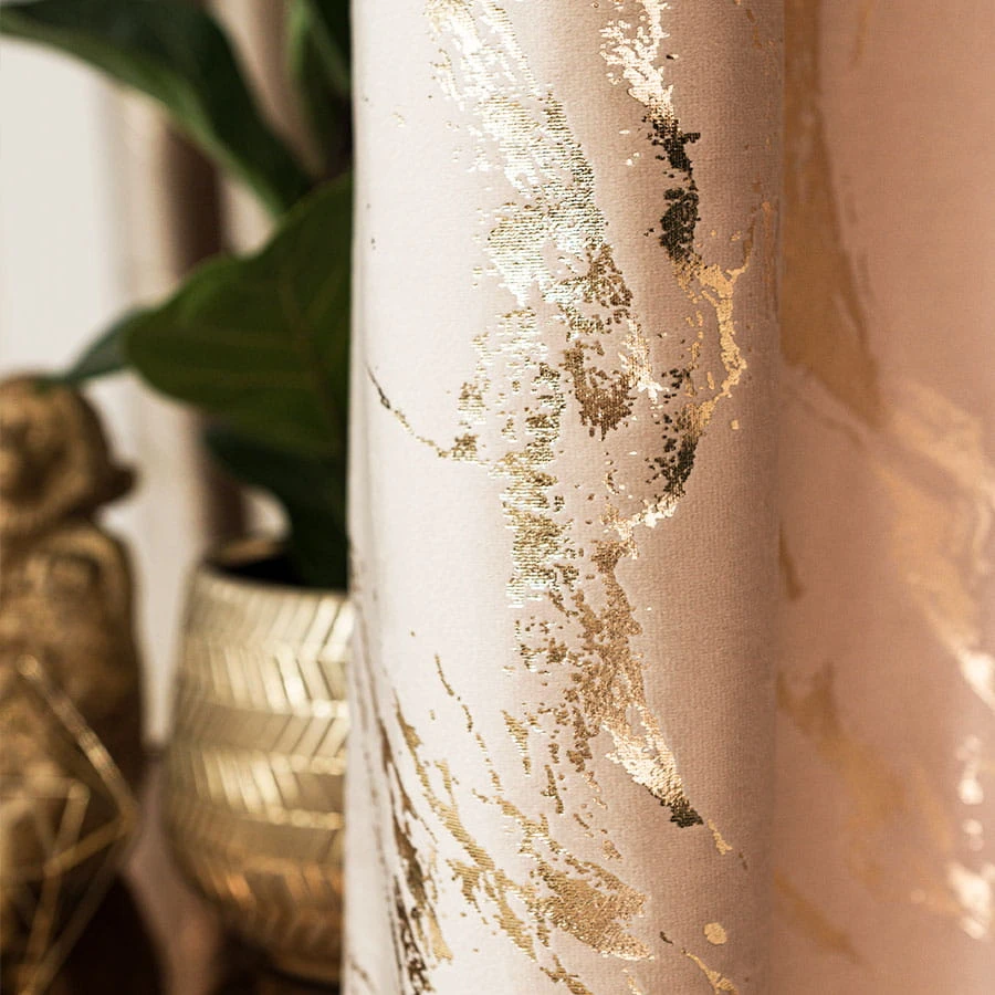 Wykonana z welwetowego materiału z dekoracyjnym jednostronnym złotym marmurowym nadrukiem to połączenie elegancji i nowoczesności. Zasłony MARMA dostępne są w dwunastu kolorach.