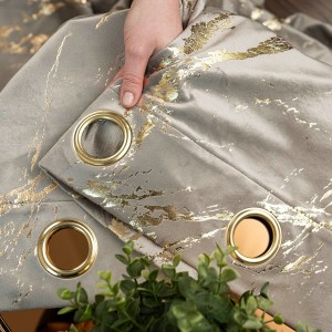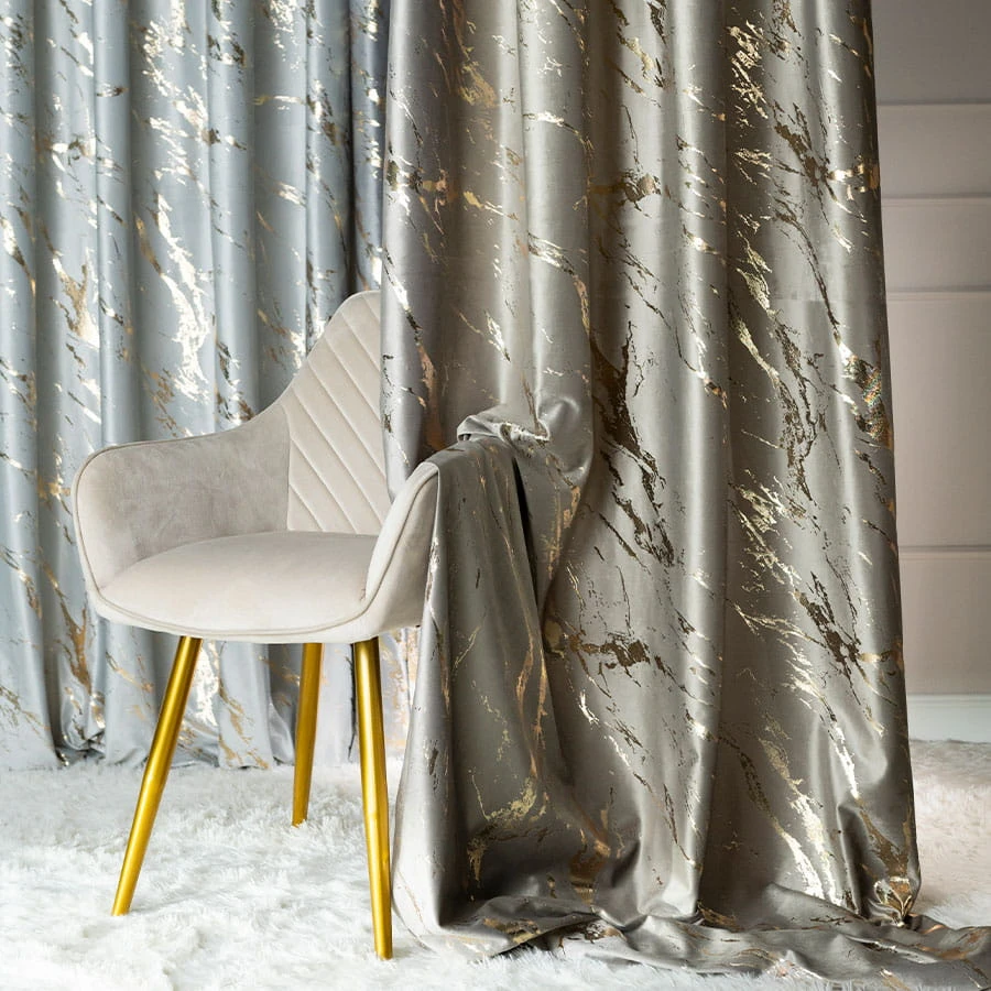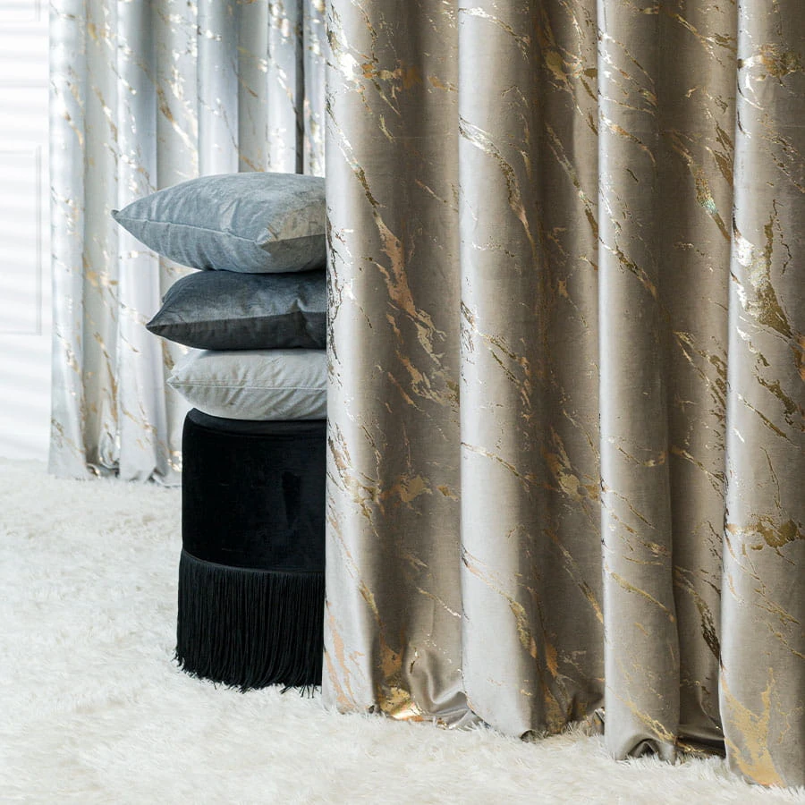 Wykonana z welwetowego materiału z dekoracyjnym jednostronnym złotym marmurowym nadrukiem to połączenie elegancji i nowoczesności. Zasłony MARMA dostępne są w dwunastu kolorach.