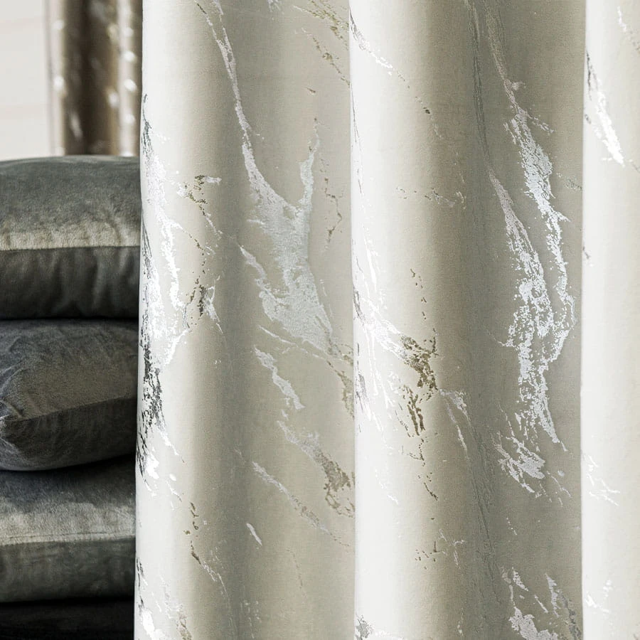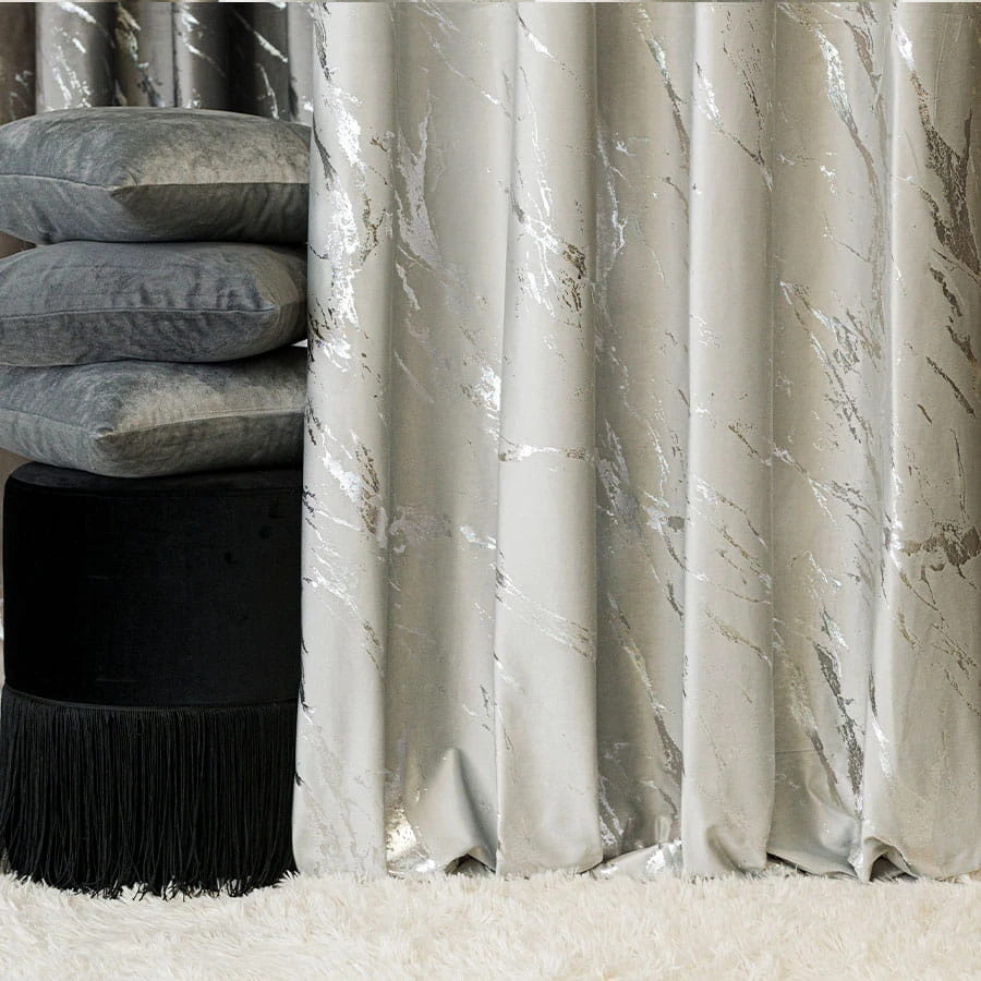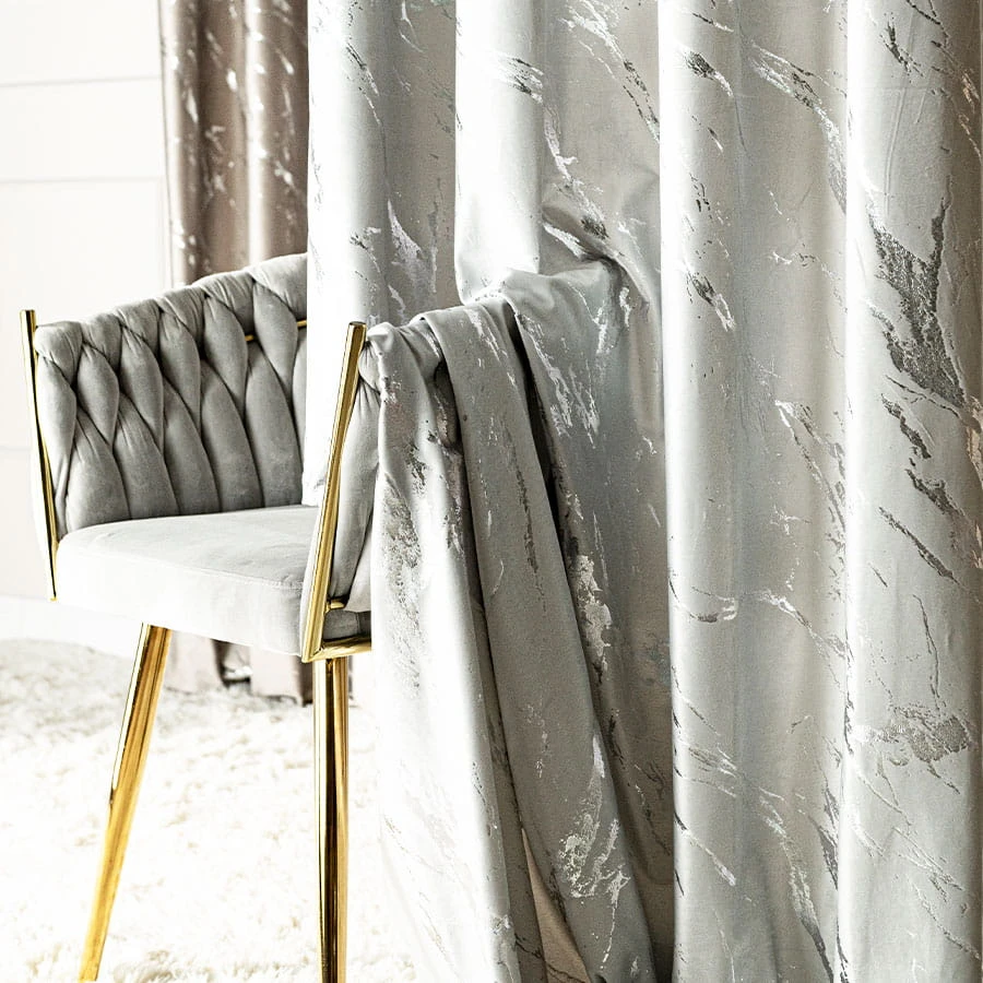 Wykonana z welwetowego materiału z dekoracyjnym jednostronnym srebrnym marmurowym nadrukiem to połączenie elegancji i nowoczesności. Zasłony MARMA dostępne są w dwunastu kolorach.