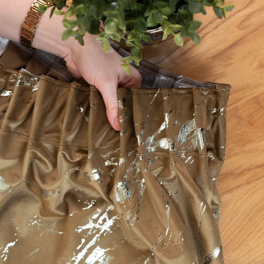 MARMA Zasłona gotowa na taśmie, szerokość 140cm x wysokość 250cm, kolor 002 brązowy ze srebrnym nadrukiem na VELVI TD0037/ZGT/002/140250/1