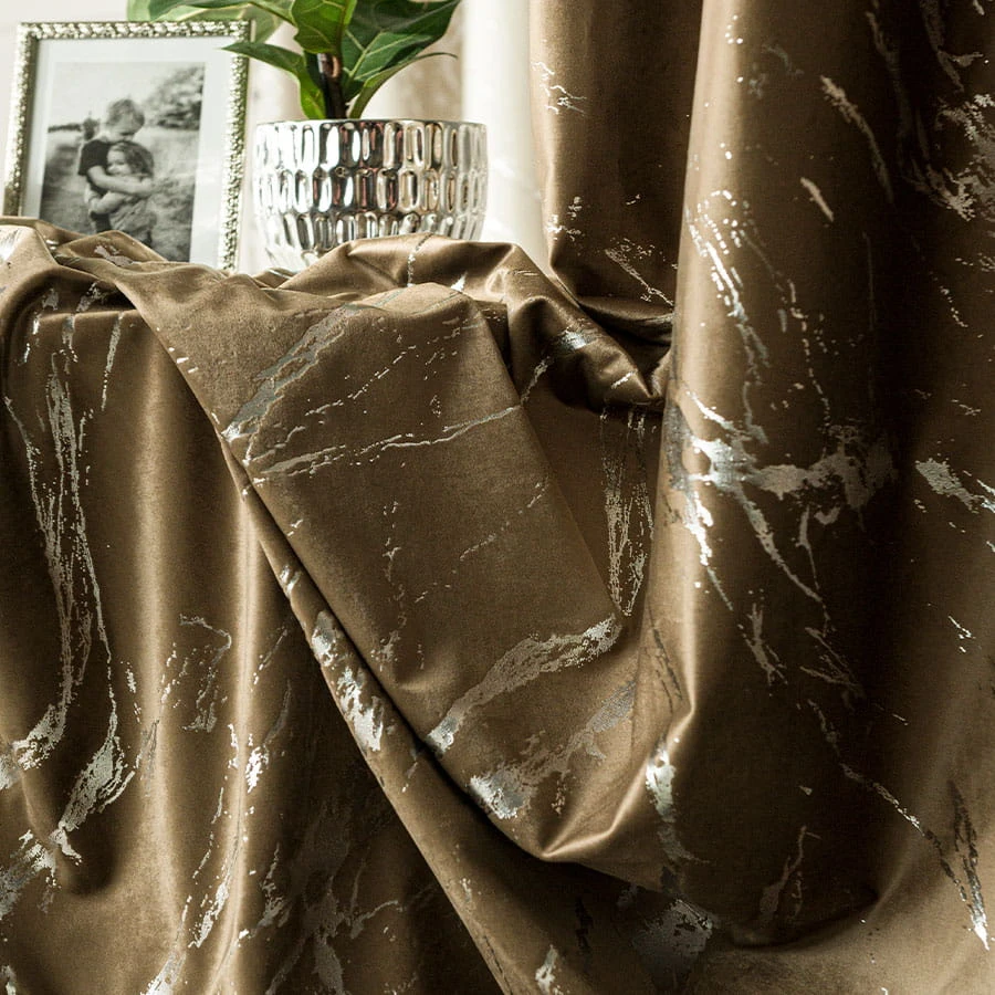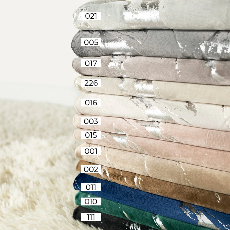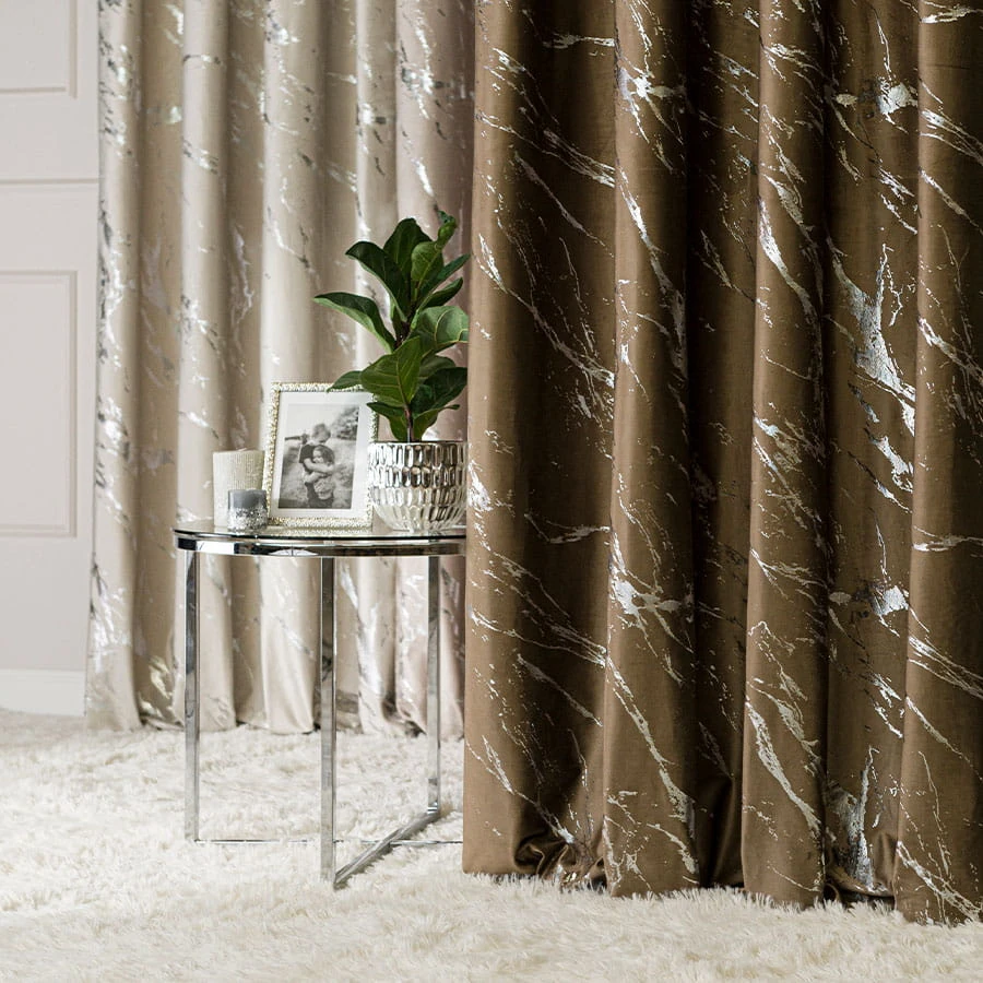 Wykonana z welwetowego materiału z dekoracyjnym jednostronnym srebrnym marmurowym nadrukiem to połączenie elegancji i nowoczesności. Zasłony MARMA dostępne są w dwunastu kolorach.
