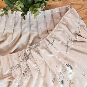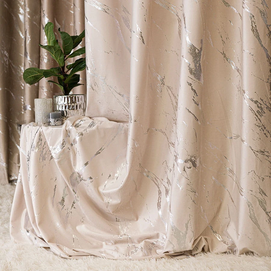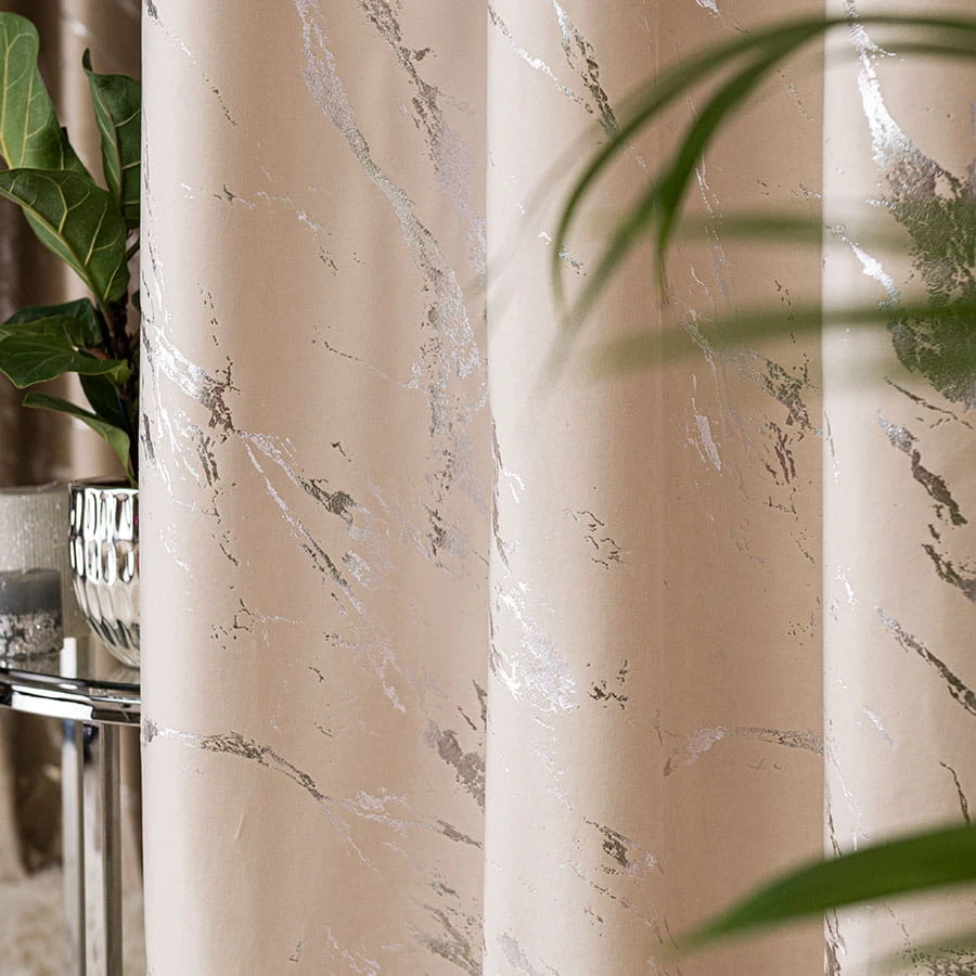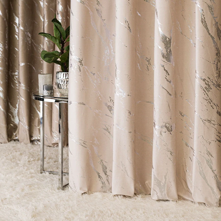 Wykonana z welwetowego materiału z dekoracyjnym jednostronnym srebrnym marmurowym nadrukiem to połączenie elegancji i nowoczesności. Zasłony MARMA dostępne są w dwunastu kolorach.