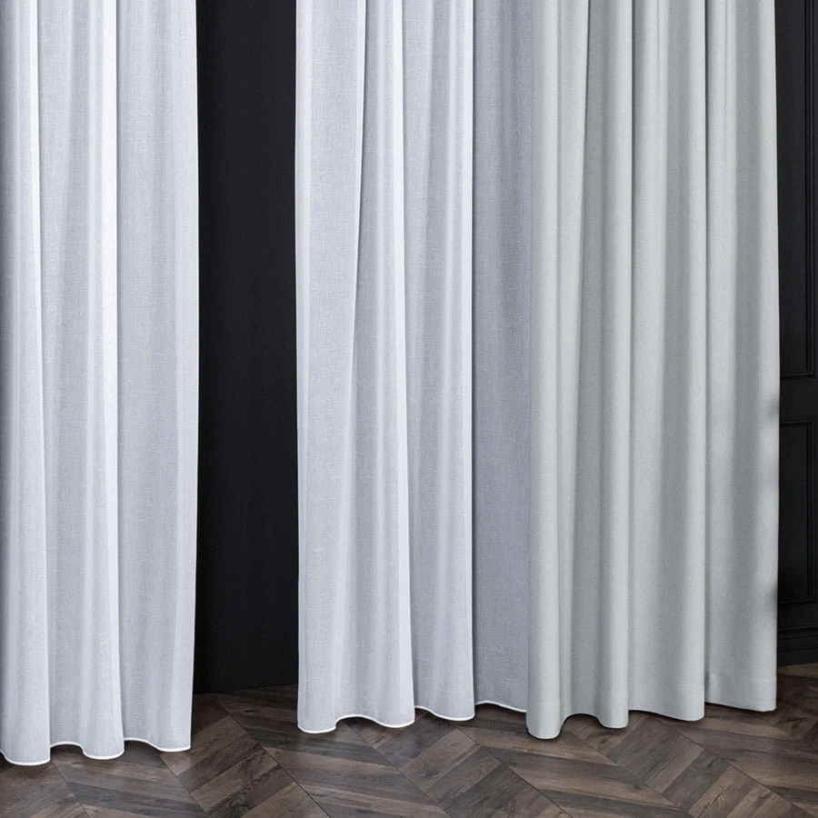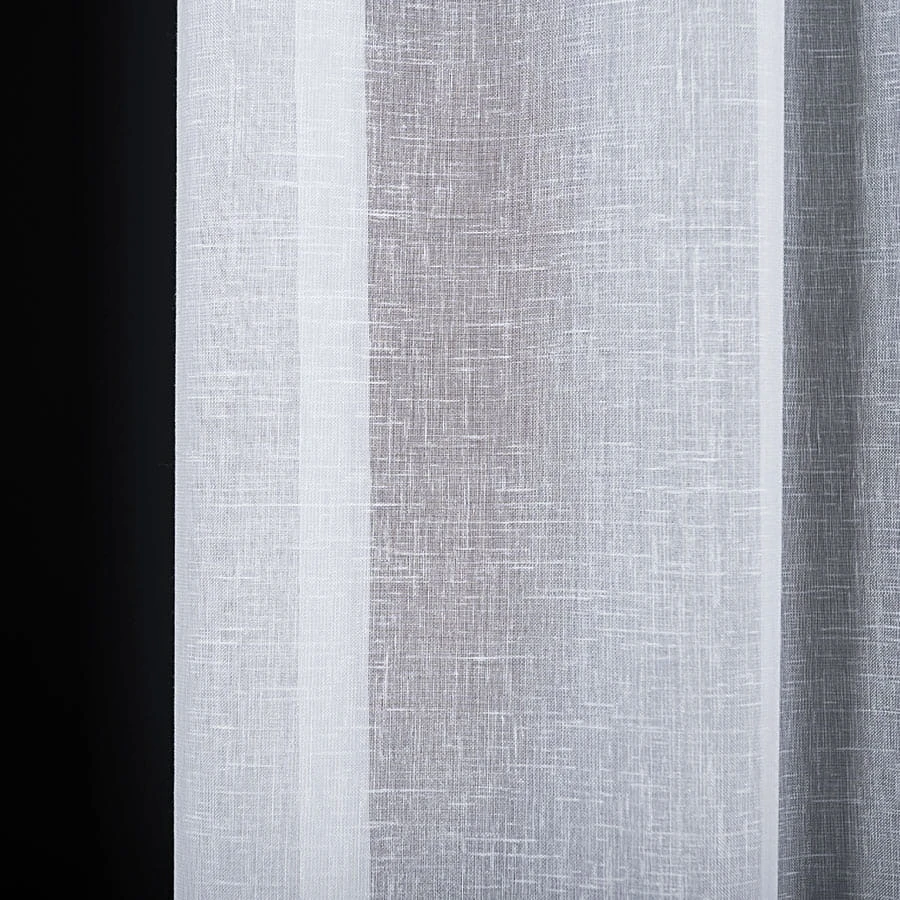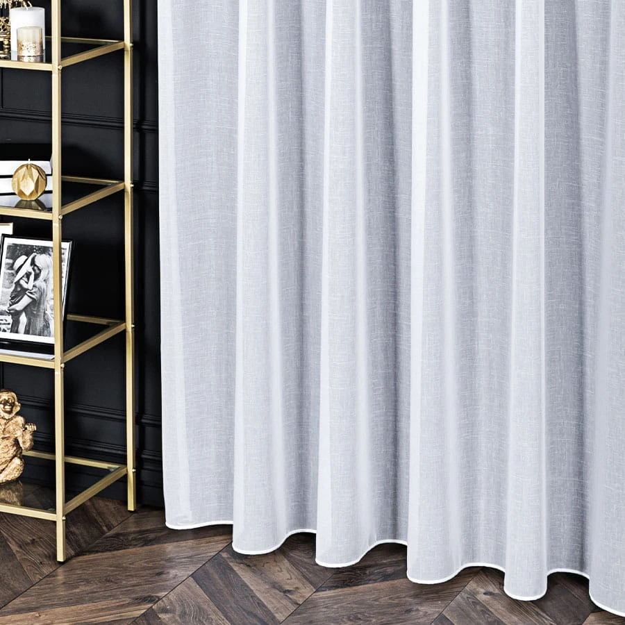Firana gładka o delikatnym chwycie i lnianym splocie. Wykończona ołowianką.